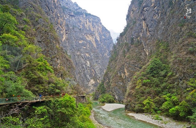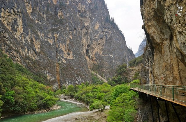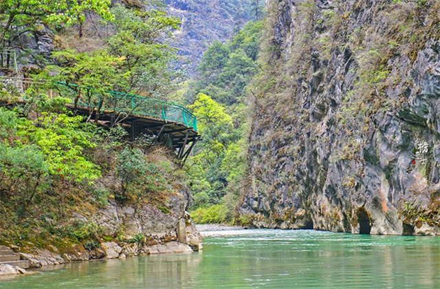 走在棧道上,身下就是清澈碧綠的湖泊,兩旁是氣壯雄渾的高山峽谷。
