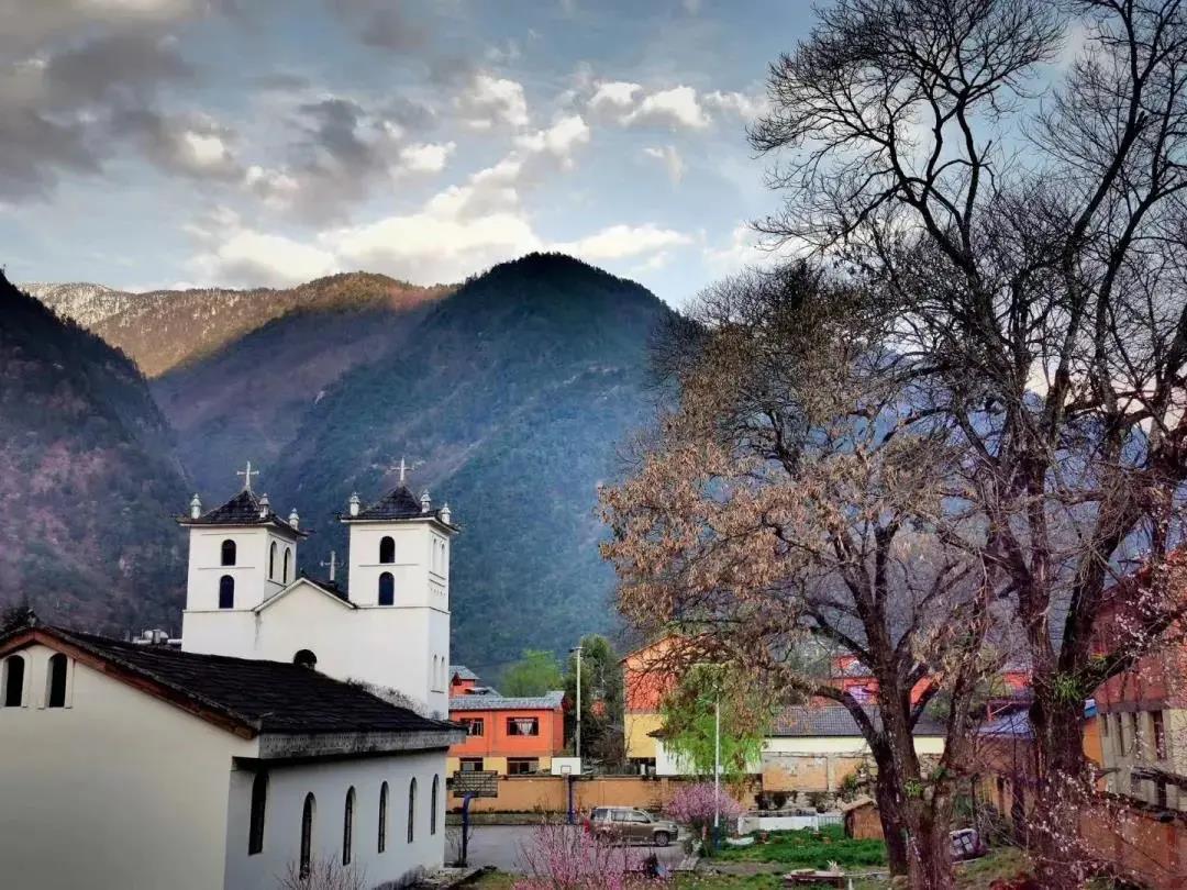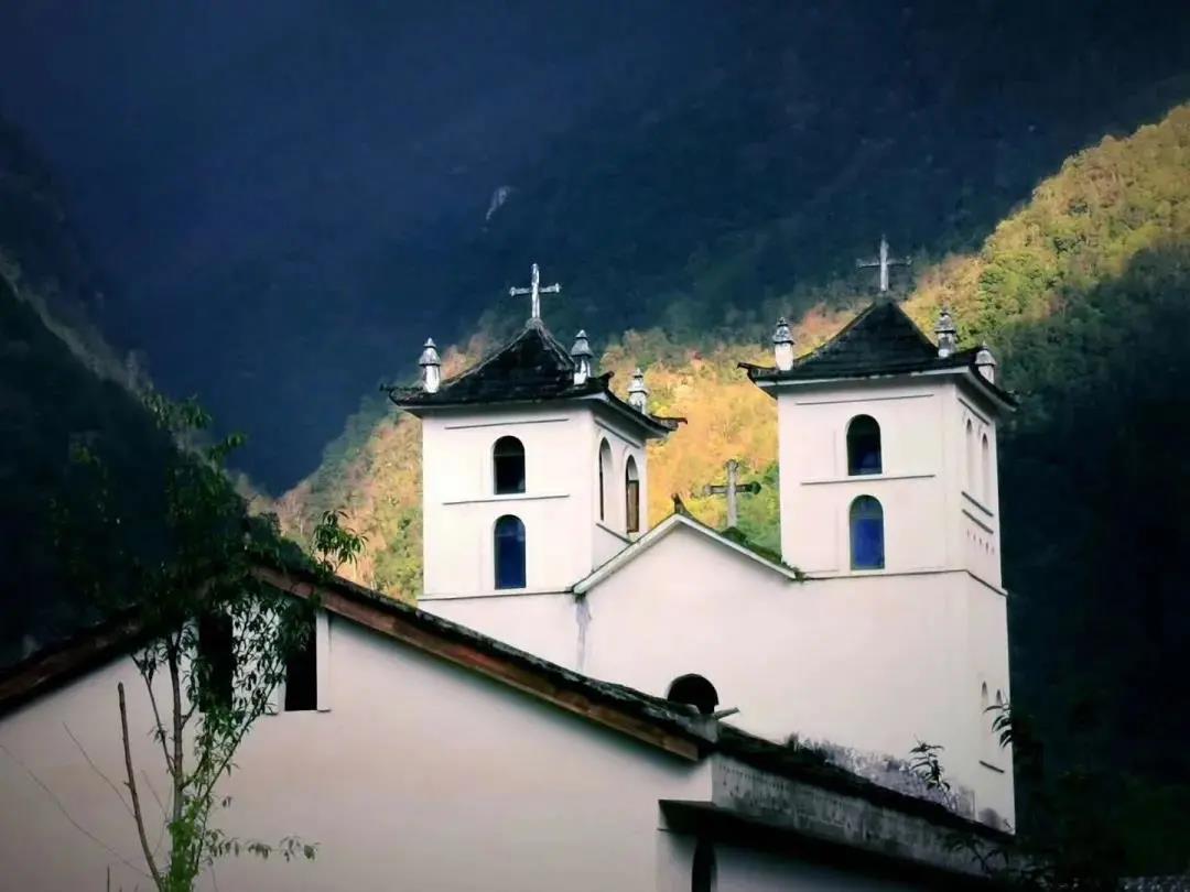 你會看見白墻拱窗的哥特式尖塔,隱秘在怒江丙中洛這座神秘的花園里,仿佛真的置身于瑞士,教堂,深山,蒼樹是怒江教堂的迷人之處。