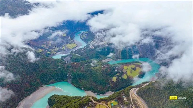 如一條翡翠巨龍在千山萬壑間奔騰咆哮,兩岸層巒疊嶂,森林如潑墨般覆蓋山脊,遠處雪峰連綿,云海翻騰不息。這氣