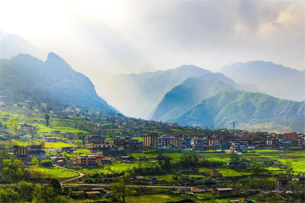 丙中洛:盛夏的丙中洛,是怒江峽谷云端展開的“青綠山水”長卷。灌滿夏水的層層梯田,如無數碧玉明鏡鑲嵌山間,倒